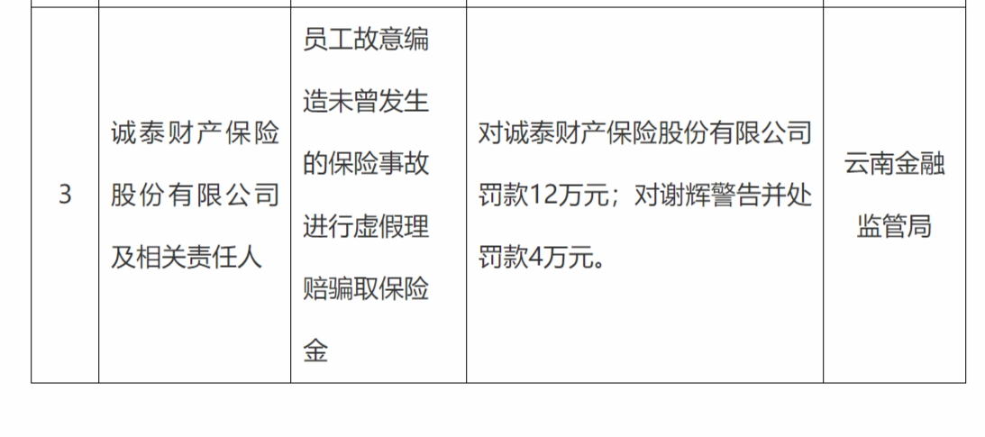 11月28日,云南金融监管局行政处罚信息公示列表显示,诚泰财产保险股份有限公司,员工故意编造未曾发生的保险事故进行虚假理赔骗取保险金,被罚款12万元;相关责任人谢辉被警告并处罚款4万元。